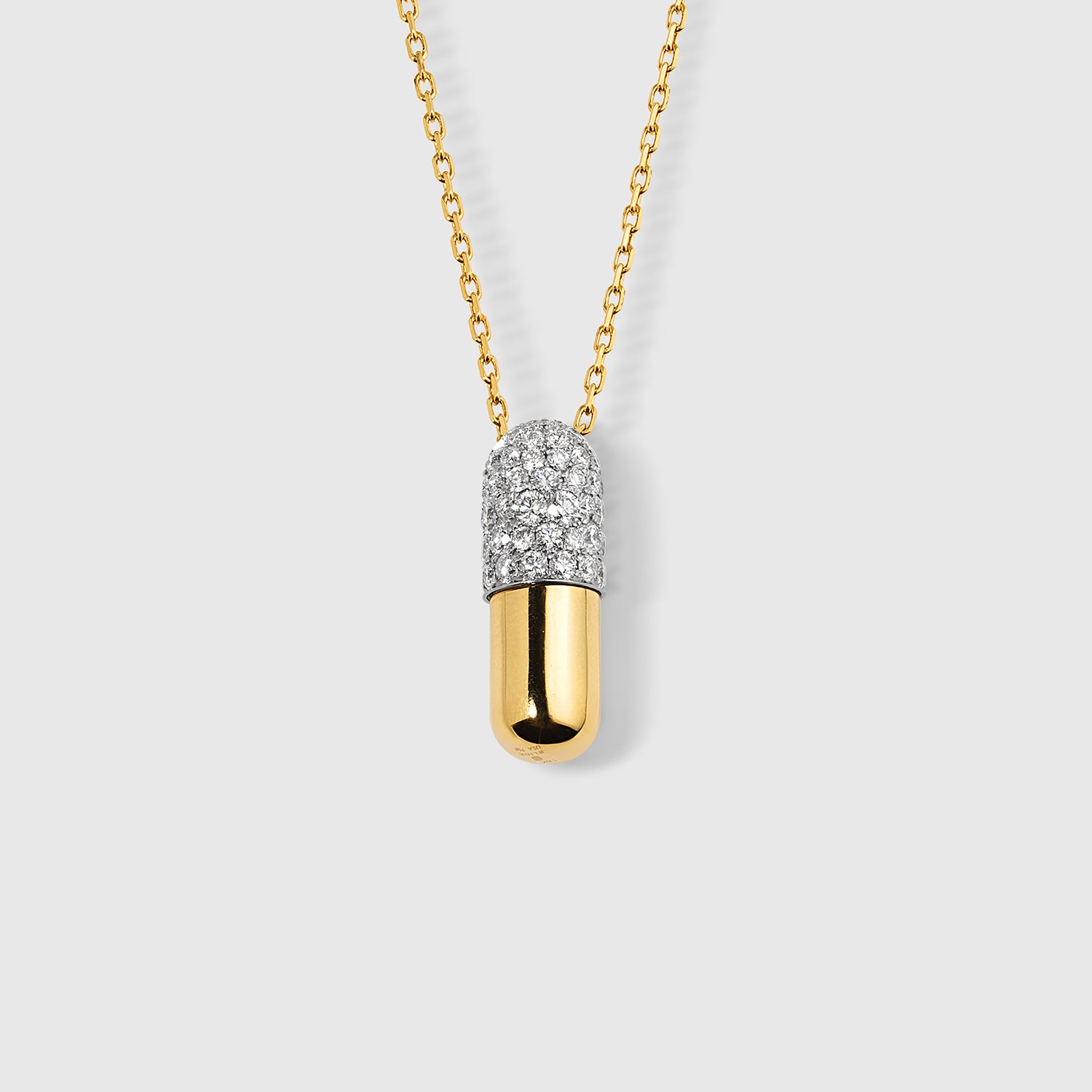 Grand Modèle screw open pill pendant in 18k Yellow Gold with approximately 1.50 carats of near colorless, very slightly included pavèd white diamonds.
