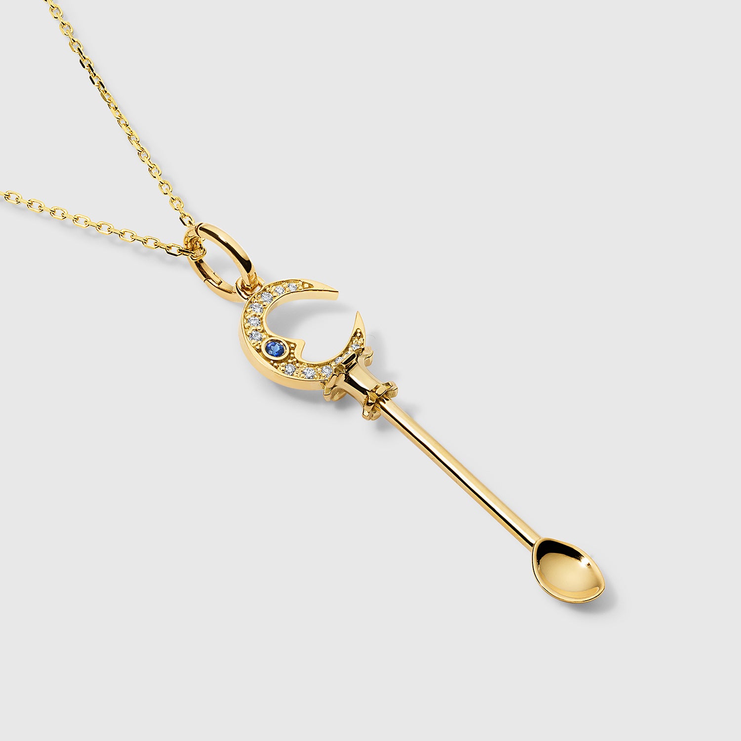 Man on the Moon Spoon Charm pendant set with near colorless, very slightly included diamonds and a blue sapphire eye. Set in 18k yellow gold.